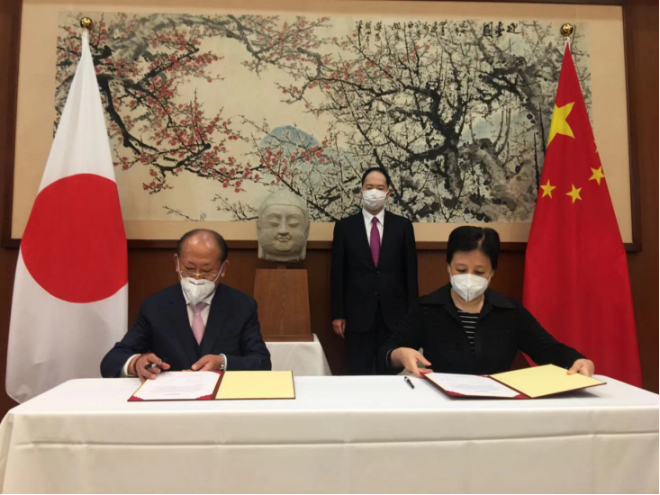 在日本中國大使館の楊宇公使(寫真中央)が見守る中、贈呈のための書類にサインする石永菁文化參事官(寫真右)と張栄さん(畫像は國家文物局が提供)。