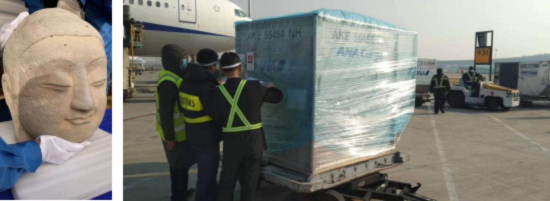 飛行機で輸送される仏像の頭部(畫像は國家文物局が提供、撮影?王卓然、馬孝辰)。