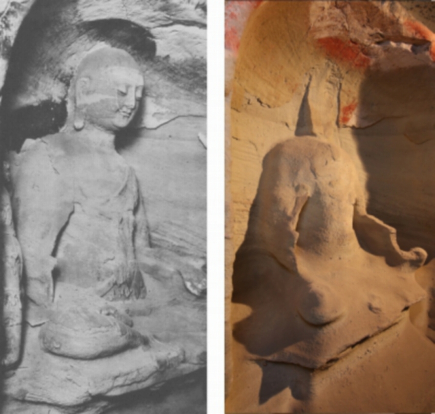 外村太次郎の「天竜山石窟」図版35(第8窟北壁龕內(nèi)仏像、寫真左)と天竜山石窟第8窟北壁仏龕主尊仏像の現(xiàn)狀(寫真右、畫像は國家文物局が提供)。