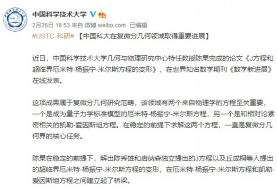 中國(guó)科學(xué)技術(shù)大學(xué)が2月26日、同大學(xué)の陳杲特任教授(26)が數(shù)學(xué)界の世界的難問を解決したと伝え、「素晴らしい」という聲がコメント欄を埋め盡くしている。中國(guó)青年報(bào)が報(bào)じた。