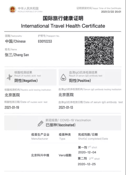 中國版「國際旅行健康証明」は、総合的な証明書で、PCR検査や血清IgG抗體検査の結(jié)果、ワクチン接種狀況などが表示される。健康証明內(nèi)には暗號化されたQRコードがあり、各國の関連當局が真?zhèn)韦虼_認し、関連の個人情報を読み取ることができる。電子版として提示できるほか、プリントアウトして紙で提示することもできる。