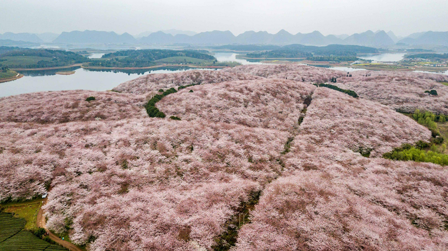 貴州省貴陽市貴安新區(qū)紅楓湖畔にある萬畝桜園では、桜の花が満開を迎えており、一面に広がる桜は大地を春色に染めていた。多くの観光客が春を満?jiǎn)摔?、花見を楽しむために、同園を訪れている。(編集KM)