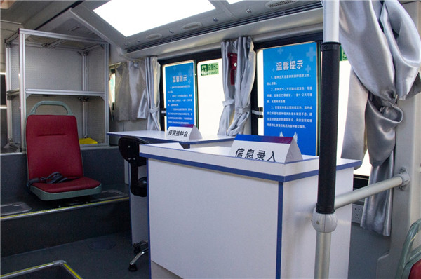 一見(jiàn)したところ普通のバスのようだが、車(chē)內(nèi)に入ると別世界が広がっている。待合席から情報(bào)入力席、そしてワクチン接種席があり、さらにワクチンを冷蔵する専用の「冷蔵庫(kù)」がある。車(chē)內(nèi)でワクチン接種の全プロセスを行うことができる。北京日?qǐng)?bào)が伝えた。