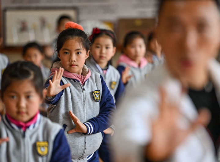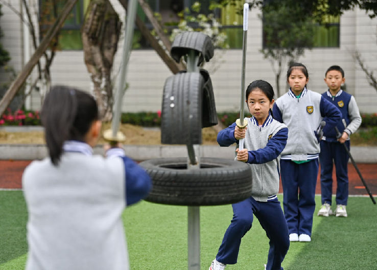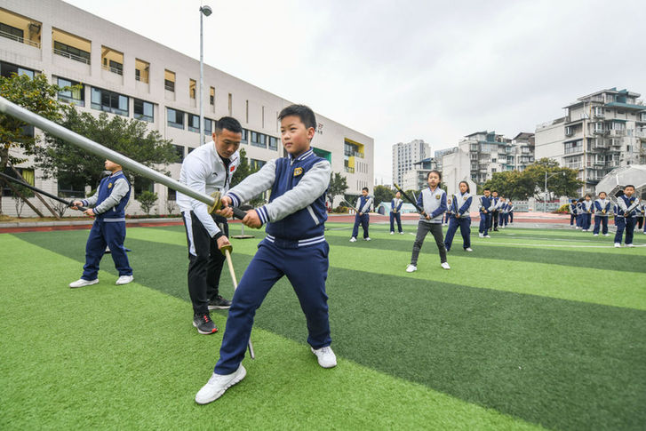 四川省成都市金牛區(qū)の迎賓路小學(xué)校の児童たちは、足の動(dòng)きを揃え、唐の時(shí)代の模造刀をしっかり握って、五行拳をベースに考案された刀法?五行刀を練習(xí)していた。新華社が報(bào)じた。