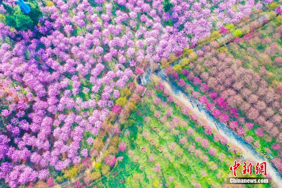 湖南省常寧市羅橋鎮(zhèn)廟山村桜花園では初春を迎え、約2平方キロメートルに広がる桜の花が春の暖かな日差しを受けて艶やかに咲き誇り、一面の美しい桜色が大地に春の彩りを添えていた。詳しくはこちらへ