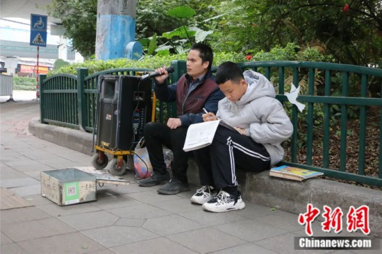 「路上ライブ」する視覚障礙者の父親の隣で一心に勉強(qiáng)する少年の姿