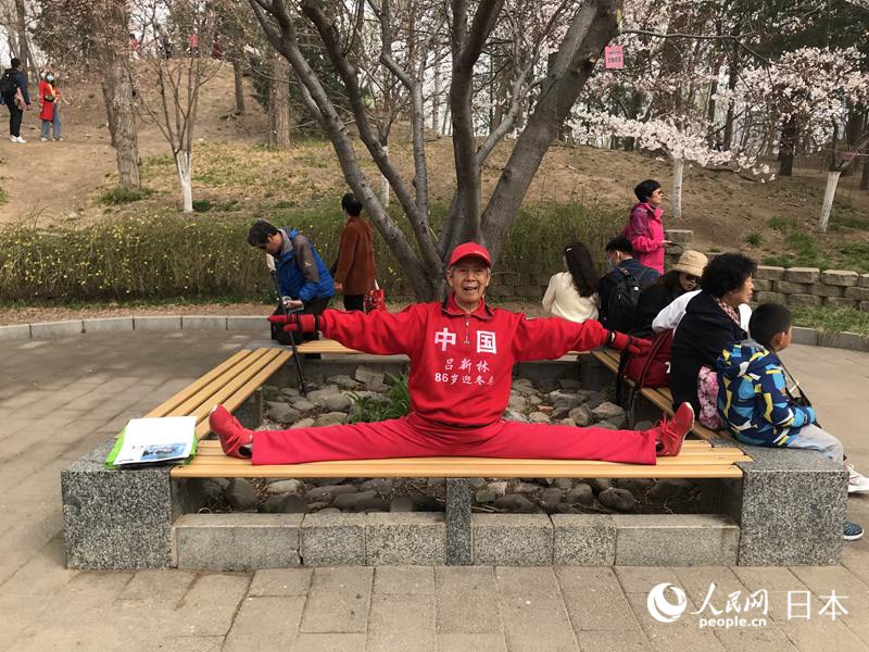 そんな中、ひときわ目を引いていたのが、赤いジャージ姿の開腳パフォーマンスおじいちゃん。御年86歳で、ご本人の弁によれば、「3歳から練習(xí)している」とのこと。スマホやカメラを向ける周囲の人たちを感嘆させていた。