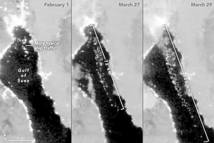 事故前と事故後のスエズ灣(寫真はNASA提供)