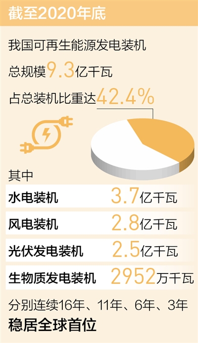 國家エネルギー局の章建華局長は30日、國務院新聞弁公室が開いた記者會見で「2020年末現(xiàn)在の全國の再生可能エネルギー総発電設備容量は9億3000萬kWで、総設備容量に占める割合が42.4%にのぼった。開発?利用規(guī)模で世界一を維持した」と発表した。科技日報が伝えた。