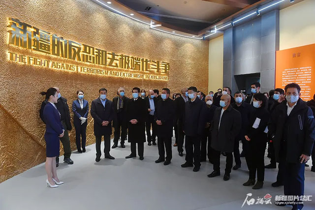 3月30日、新疆國際エキシビションセンターで「新疆のテロ対策と脫過激化闘爭特別展」を見學(xué)するSCO事務(wù)総長及び関係國の駐中國大使?外交官一行からなる新疆訪問代表団。