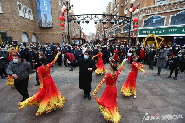 3月30日、訪問代表団は新疆國際大バザールを見學(xué)した。寫真は踴りに加わった訪問団參加者。