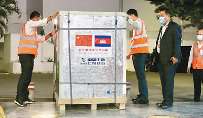 中國がカンボジアへに寄贈したワクチン第二弾が、3月31日夜にプノンペンに到著した。寫真は作業(yè)員がワクチンを運ぶ様子。(撮影?高炳南)
