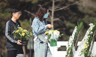 4月4日、遼寧省瀋陽市にある瀋陽抗米援朝(朝鮮戦爭)烈士陵園で、人々が烈士の記念碑に花かごを供えた。(撮影?姚剣鋒)