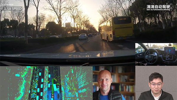滴滴自動(dòng)運(yùn)転の孟醒COO(右下)とUdacityのセバスチアン?スラン創(chuàng)業(yè)者兼會(huì)長(zhǎng)が、夕方のシーンについて議論した。左上は車(chē)內(nèi)カメラの映像、左下はレーザーレーダーの映像、右の中央は操縦席の様子。畫(huà)像は滴滴が提供。
