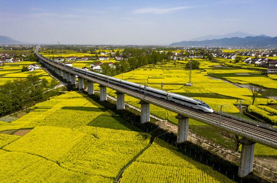 2021年3月24日、陝西省漢中市で競(jìng)うように咲き誇る菜の花畑を駆け抜ける高速鉄道(撮影?唐振江/人民図片)