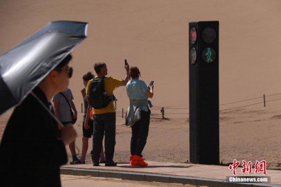 敦煌市によると、同景勝地內(nèi)ではラクダが歩くコースと観光客の歩道、車(chē)両の道路が交差しており、人、車(chē)、ラクダの流れが悪くなり、渋滯が発生するケースが増えている。そのため、同景勝地は調(diào)査?研究を経て、人、車(chē)、ラクダの流れを円滑化させるための信號(hào)機(jī)を打ち出した。これによりラクダは信號(hào)機(jī)の指示に従って、秩序正しく、橫斷歩道を渡るようになった。信號(hào)機(jī)が赤になれば、車(chē)両はラクダや歩行者に進(jìn)行を譲ることになり、車(chē)を停めてラクダが歩くのをゆっくりと眺めることもできる。