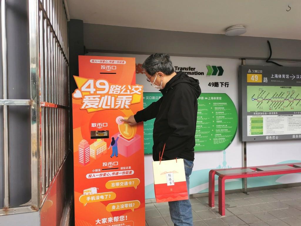 4月14日、上海49番路線バスの上海體育館停留所に登場した「思いやり乗車」機から現(xiàn)金を受け取る乗客(寫真著作権は東方ICが所有のため転載禁止)。