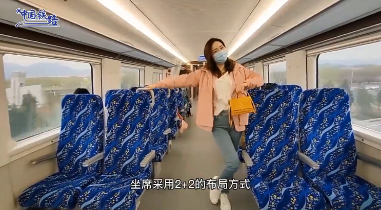 車両は両開き扉が採用され、通路も広々としており、座席は1列2人掛け+2人掛けで、スマホなどの充電ができるようにコンセントも設(shè)けられている。ブルーが基調(diào)の座席とピンクのラインが入った車體の組み合わせは、広い青空の下にピンクの花が咲きほこり、生気に満ちあふれた様子をイメージしている。
