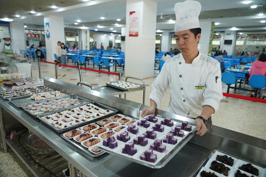 4月20日、出來上がったばかりのバラ料理を並べる食堂従業(yè)員(寫真著作権はCFP視覚中國が所有のため転載禁止)。