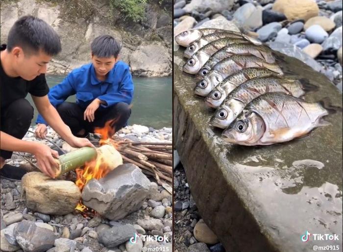 森を抜け、小川にやって來たその男性は、麥わら帽子をかぶり、足にはわらじを履き、大自然の中で料理を作る。ジャガイモと青ネギをすり鉢でペースト狀にし、丸めて數(shù)本の釣り針に付け、小川に放り投げる。すると小さな魚がピチピチと水面から飛び跳ねる。石をまな板代わりにし、釣った魚のうろこを取り、身に十文字の切り込みを2ヶ所入れて、竹筒の中に入れる。そして赤唐辛子に生姜、ニンニクペーストを魚にのせて、油を振りかけ、塩とクミンパウダーを振ってから、竹筒に蓋をしてたき火にかける。焼けるのを待っている間、小川で石を投げて水切りをしていると、しばらくして魚の焼ける香ばしい匂いが漂ってきて、出來上がりを知らせてくれる。竹筒を開くと、唐辛子の下からジューシーな魚が美味しそうな光沢を見せていた。