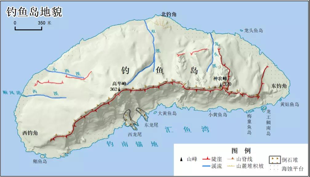 釣魚島は削剝?侵食された低山丘陵で、地形は険しく、中央の山脈の稜線は東西に走り、主峰の高華峰(海抜362メートル)と神農(nóng)峰(海抜320メートル)を結(jié)び、島中南部に位置し、北側(cè)は傾斜がやや緩く、南側(cè)はやや険しい地形構(gòu)造を形成している。