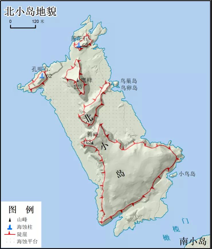 北小島は削剝?侵食された丘陵地形で、起伏が比較的大きい。北小島南東部の獅峰(118メートル)はその北西の鷹峰(125メートル)、蓮花石(62メートル)、孔明石(62メートル)という3つの獨(dú)立した険しい巖と海食臺(tái)でつながっている。