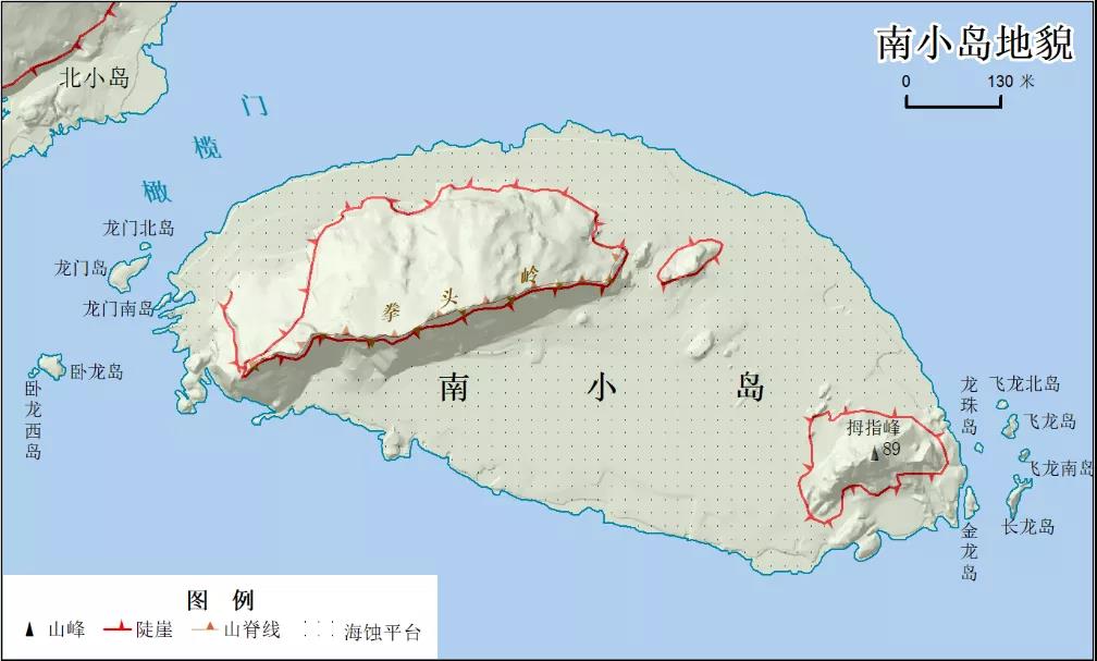 南小島は削剝?侵食された丘陵地形で、全體的に楕円形を呈している。島の主體の拳頭嶺は南東の険しい巖「拇指峰」と海食臺(tái)でつながっている。地形は北西部と東南部が高く、中間部が低い。