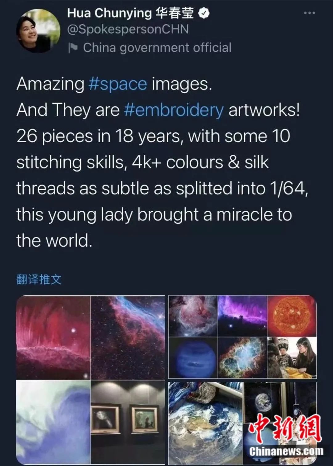 中華人民共和國(guó)外交部(外務(wù)?。┬侣勊舅鹃L(zhǎng)の華春瑩報(bào)道官はツイッターでその作品の素晴らしさを紹介し、米國(guó)航空宇宙局(NASA)は幾たびとなく作品の買(mǎi)い取りを持ち掛けたものの、それを拒絶された。そんな話(huà)題を集める蘇州刺繍作家である陳英華さんは、2021年度中國(guó)宇宙の日始動(dòng)並びに中國(guó)宇宙大會(huì)開(kāi)幕式典の授賞式において、その刺繍作品「宇宙星空シリーズ」で、中國(guó)國(guó)家航天局(宇宙局)から「宇宙探索と蕓術(shù)アイデアコンテスト」の特別賞を授與された。中國(guó)新聞網(wǎng)が伝えた。