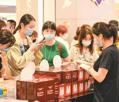 海南省??谑腥赵聨趫雒舛惖辘扦隙啶斡Q光客が商品を購入。海南離島免稅ショッピングの人気が続いている。撮影?王程竜/人民視覚