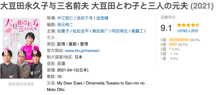 ここのところ、有名人の離婚ニュースがしばしば大きな話題となっているが、日本では「3人の元夫」をめぐるドラマが大ヒット放送中だ。ドラマのタイトルは「大豆田とわ子と三人の元夫」。主演は松たか子で、中國のコミュニティサイト?豆瓣でもレビューが9.1ポイントと、好評を博している。