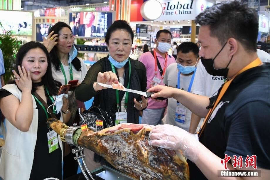 會場でスペイン産ハムを試食する來場者(撮影?崔楠)。