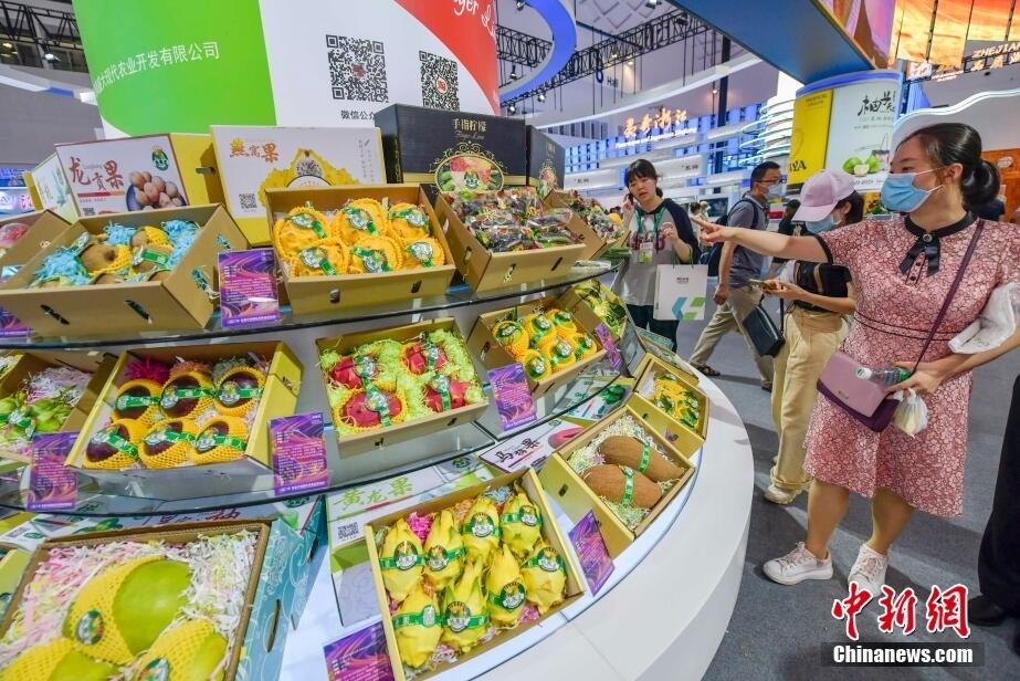 海南省のパビリオンに展示されれ、注目を集めていた海南の特色あふれるトロピカルフルーツ(撮影?駱雲飛)。