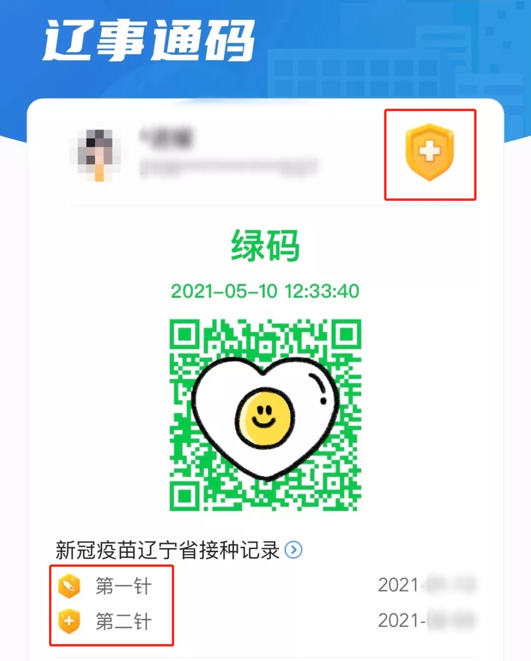 遼寧省の健康コードには、ゴールドシールドの表示が加わっている。1回目のワクチン接種を終えると、金色の六角形が表示され、2回目の接種を終えるとゴールドシールドが表示される。