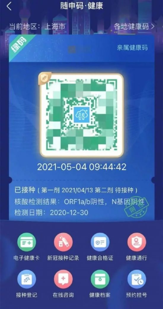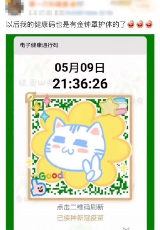 今月3日、ワクチン接種を受けた上海の市民は、アプリ健康雲(yún)の「健康コード」が、接種者限定のゴールドフレームになっているのを発見した。