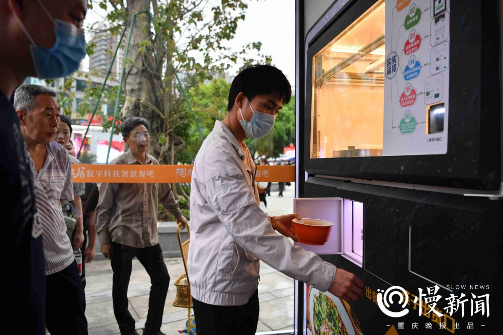 楊家坪歩行者天國(guó)の24時(shí)間営業(yè)スマート自販機(jī)は、和坪公園の近くにあり、今年の労働節(jié)(メーデー、5月1日)連休中に運(yùn)営をスタートさせた。自販機(jī)の前には30人以上の買(mǎi)物客が並んでいたが、料理が出てくるまでスピーディなため、多くの人々が、その場(chǎng)で湯気が立ち上る熱々の麺や定食、バオズを手に、さっそく味わっていた。スマート自販機(jī)の面積は約30平方メートル、麺類(lèi)販売機(jī)?パオズ販売機(jī)?定食販売機(jī)?総合販売機(jī)の4エリアに分かれており、パオズ?麺類(lèi)?定食?飲み物などさまざまな料理や飲み物が販売されていた。パオズは4個(gè)8.8元(1元は約17.0円)で、オーダー後30秒で提供される。定食は1人前11.8元から、約1分で出來(lái)上がり、麺は150グラム10元、出てくるまでに約1分半かかる。(編集KM)