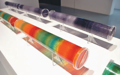 データの処理と変換により、関氏は氷床コアが反映する気溫とCO2含有量の変化のデータを色に置き換えた。気溫の変化を反映するカラフルな円筒は、赤が気溫が高いことを、青が気溫が低いことを示している。白と黒の円筒はCO2含有量の変化を反映し、黒いほどCO2の含有量が多い。「この作品で世界の気候変動のプロセスを直観的に感じ、人類活動の世界の気候への影響を考え直してもらいたい」と関氏。