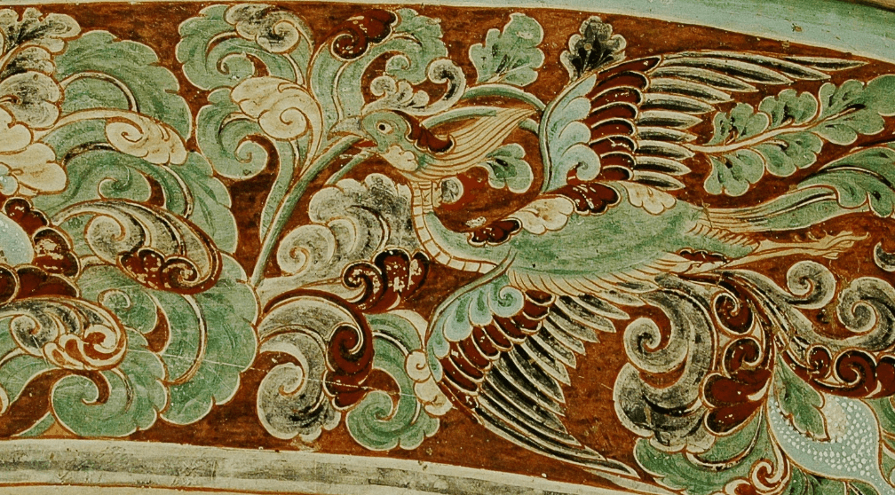神鳥が大きな花の模様の中に溶け込むように描かれている。