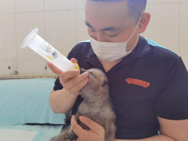職員によると、5月上旬、ハルピン極地公園でホッキョクオオカミの赤ちゃん數(shù)匹が誕生した。しかし、その3日後、母親オオカミが突然そのうちの1匹に対し、育児放棄したため、その赤ちゃんオオカミは命が危険な狀態(tài)となった。この緊急事態(tài)をうけて、飼育員は直ちに完全人工飼育に切り替えた。