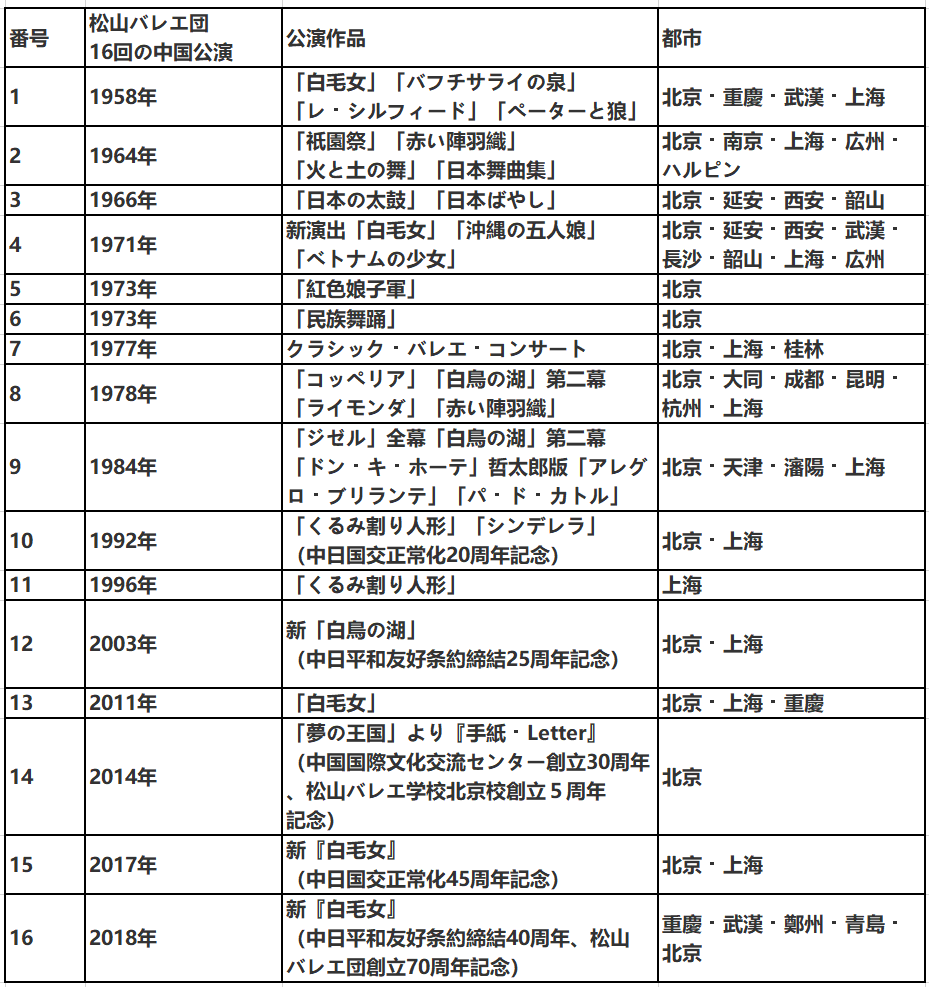 松山バレエ団は、1958年に初の中國(guó)公演を?qū)g現(xiàn)。北京や上海、重慶、武漢など、訪問(wèn)した都市で、大きな話題となった。1958年から2018年の間に、松山バレエ団は16回中國(guó)公演を行い、「白毛女」を縁に、バレエを通して、中國(guó)の人々と心を通じ合わせ、互いに信頼を深め、中日両國(guó)の友好交流において不可欠な文化交流の架け橋となり、両國(guó)の友好の歴史を刻み、その証人となってきた。