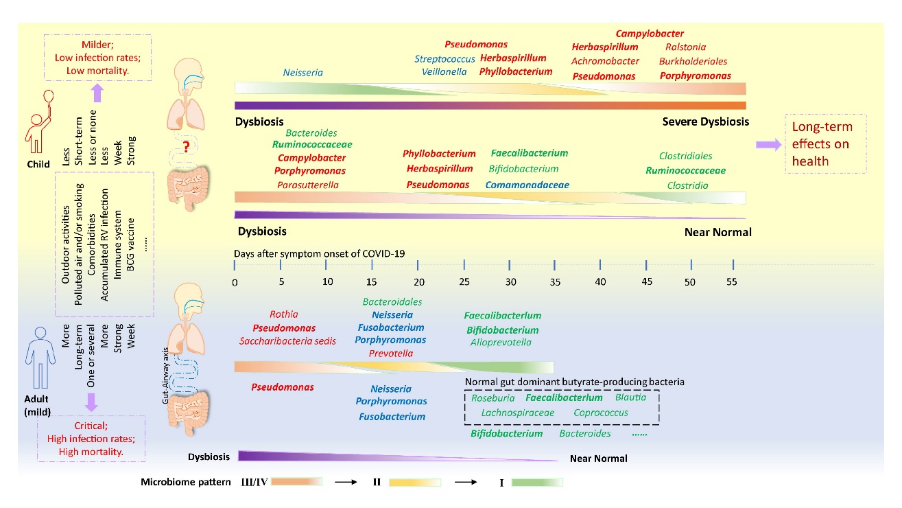 子どもと成人の新型コロナウイルス感染期間中の上気道と腸內(nèi)菌の変化説明図(畫像の出典:雲(yún)南生物資源保護?利用國家重點実験室)。