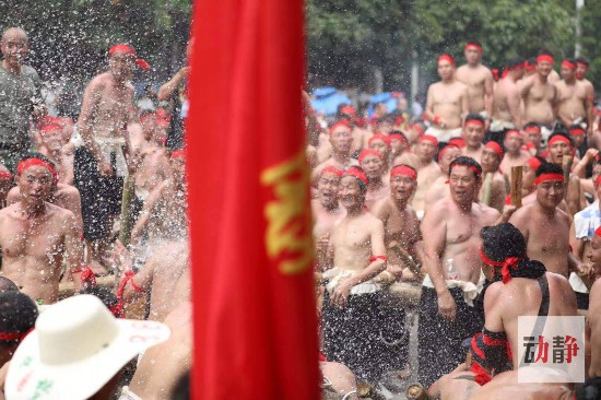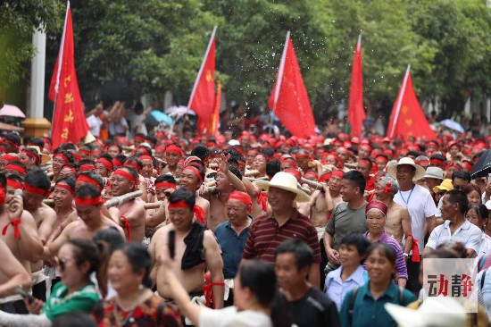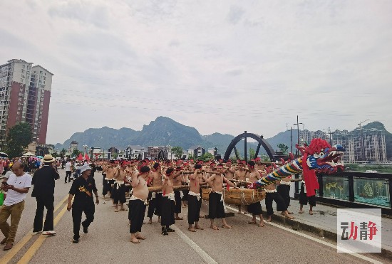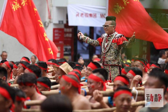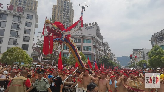 同日午後1時(shí)半、上半身裸の擔(dān)ぎ手2169人が、大きな掛け聲を上げながら98.8メートルのドラゴンボートを擔(dān)ぎ、施秉老大橋の下の川に向かって、水舞雲(yún)臺(tái)音楽噴泉広場(chǎng)を出発した。