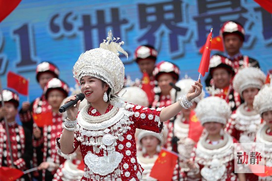 その後ろには、少數(shù)民族の伝統(tǒng)衣裝を著た1萬(wàn)人以上の女性が200組に分かれて、歌を歌ったり、ダンスを踴ったりしながら延々とねり歩き、街中が賑やかなお祭りムードに包まれた。