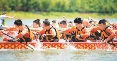 6月13日、湖南省汨羅市で行われたドラゴンボート競技會。寫真は競技中の漕ぎ手たち。(撮影?新華社記者 陳思汗)
