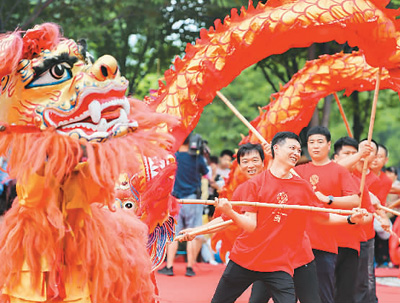 6月13日、浙江省湖州市長興県虹星橋鎮(zhèn)白水村の村民たちが無形民俗文化財の竜舞?獅子舞のパフォーマンスを披露。(撮影?人民視覚 譚雲(yún)俸)