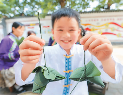 6月13日、江西省吉安市峽江県金坪民族郷新民村の子どもたちが包み終わったちまきを見せてくれた。(撮影?周歓、陳福平)