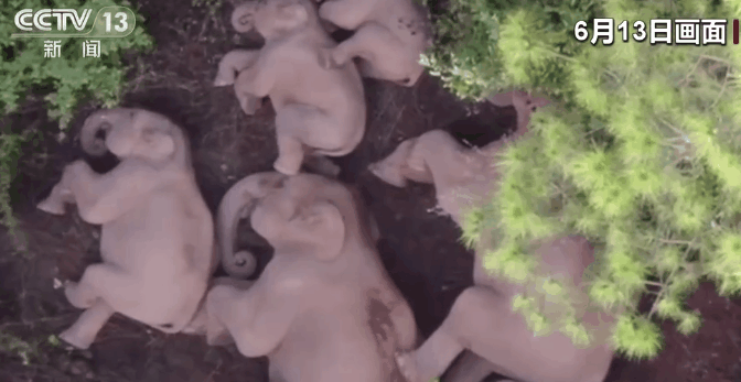 13日朝、ドローンが再び橫たわって寢ているゾウを捉えた。動畫見ると、子ゾウが足をもう1頭の子ゾウの背中にのせると、その子ゾウはまるで「腰を伸ばして」といった様子で、その足元で寢ている大人のゾウの鼻と顔を蹴っている。
