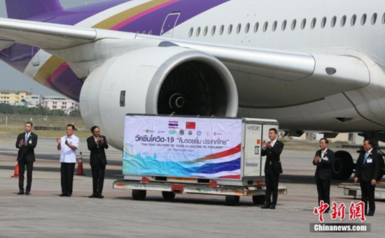 2月24日、バンコクのスワンナプーム國際空港に到著したタイ政府が購入した第一陣のシノバックの新型コロナウイルスワクチン。飛行機を出迎えたタイのプラユット?チャンオチャ首相やアヌティン副首相兼保健相、在タイ中國大使館の楊欣代理公使(撮影?王國安)。