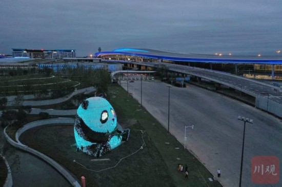 四川省の成都天府國際空港第1ターミナルビル前の芝生広場にこのほど、かわいいパンダのモニュメントが登場。パンダの名前は「団団(トゥアントゥアン)」で、夜になると、赤や青、黃色のLEDライト1萬個以上で明るく浮かび上がる。川観新聞が報じた。(編集KN)