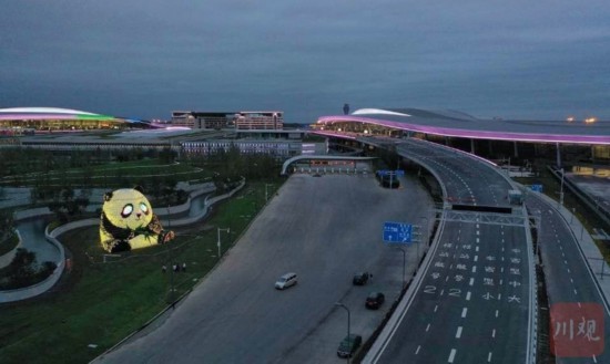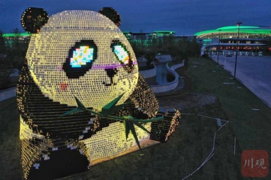 成都天府國際空港にLEDライトで明るく輝くパンダのモニュメント
