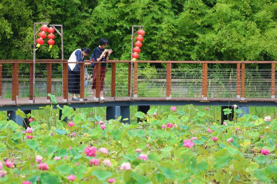気溫が上がるにつれて、上海東平國(guó)家森林公園の花卉博覧會(huì)南パークでは、ハスの花が見頃を迎えている。ハスの花展示パークでは、青々としたハスの葉が水面に敷き詰められるように広がり、鮮やかな色の花を咲かせているほか、水面にはスイレンも華麗な花を咲かせ、息を吞むような景色が広がっている。澎湃新聞が報(bào)じた。